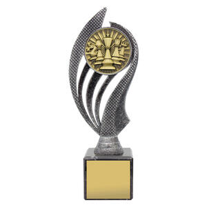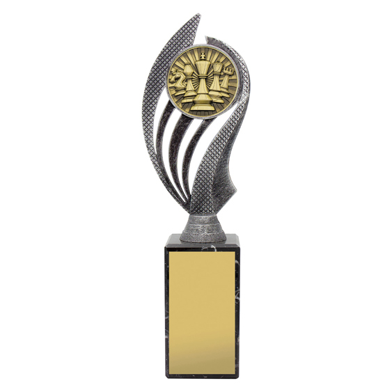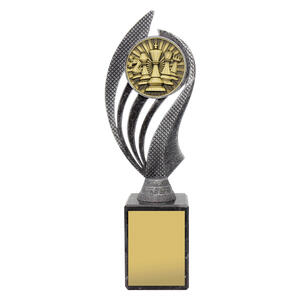 The Chess Husky Trophy combines an antique silver and gold resin design with a polished black marble base. A stylish and durable award that balances tradition with modern appeal, suitable for tournaments and schools alike.