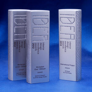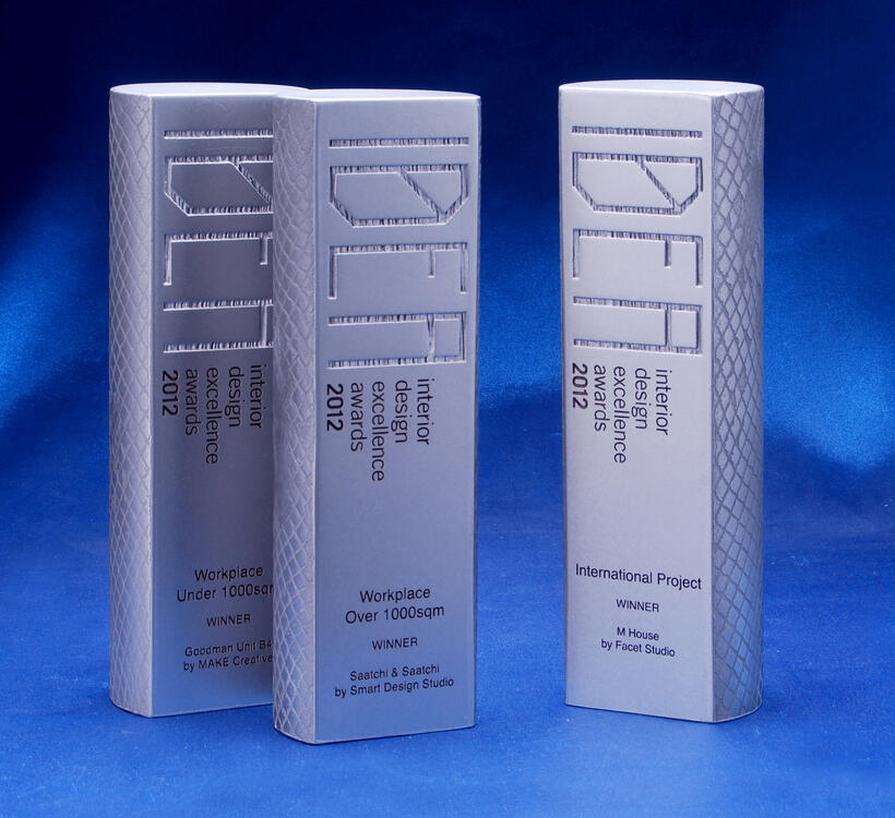 A contemporary painted timber award crafted for the Interior Design Excellence Awards. The tall block style timber design is precision engraved and finished in a sleek matte coating, showcasing intricate geometric side detailing.