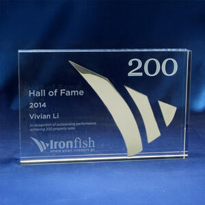 Rectangular crystal award with metallic insert detailing and precision laser etching.