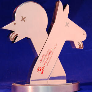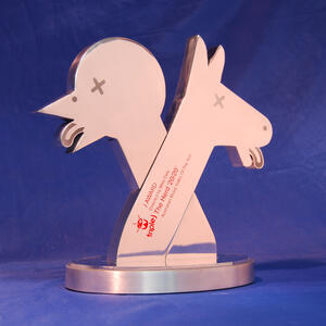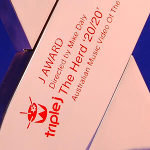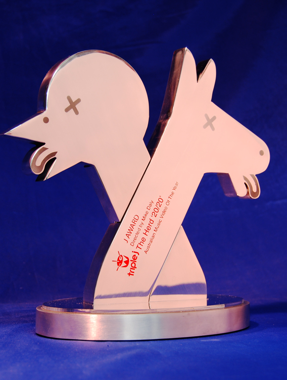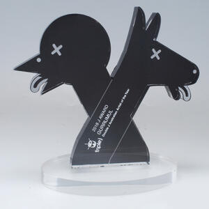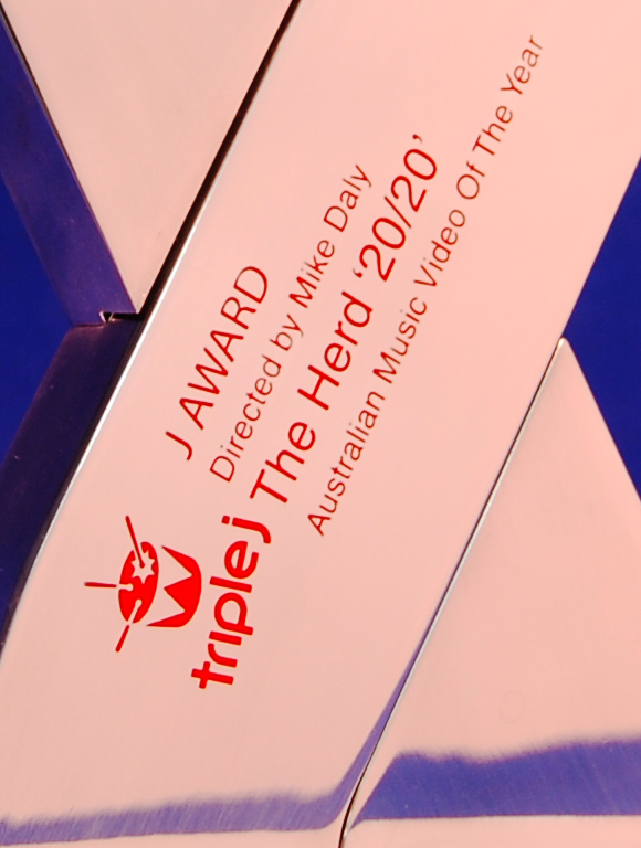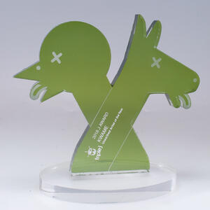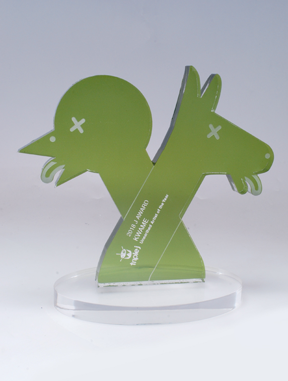 A distinctive custom acrylic trophy created for the Triple J Awards. Precision cut from clear acrylic with laser engraved and colour printed details, this contemporary piece captures a playful and creative aesthetic.