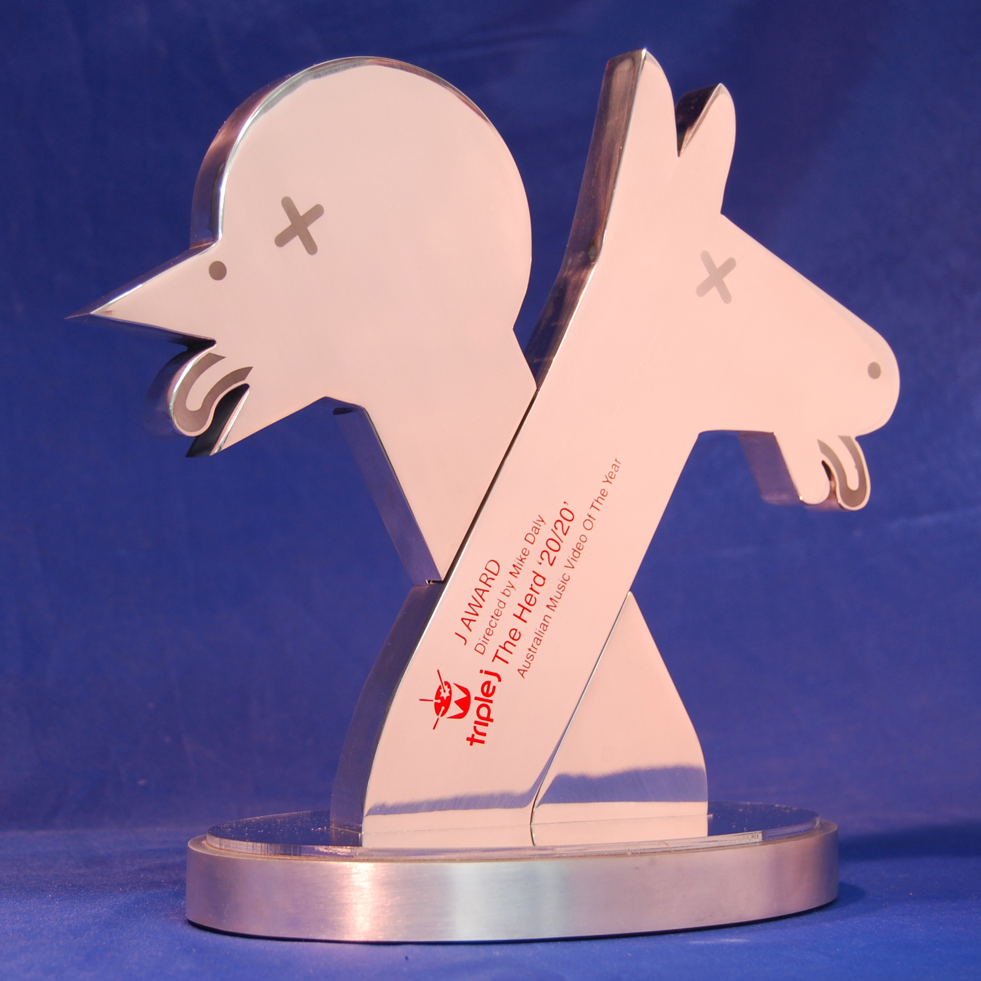 A unique mirrored alloy award sculpted into two stylised profiles with a polished finish.
