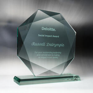 Glass trophies typically have a very slight green tinge, which can subtly affect the appearance of colour printing. In contrast, crystal trophies are completely clear.