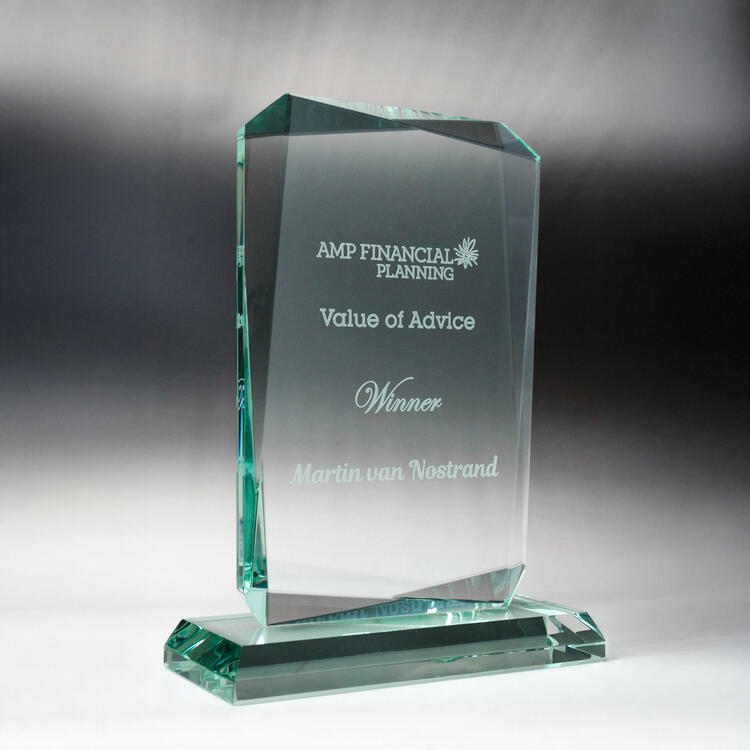 Glass trophies typically have a very slight green tinge, which can subtly affect the appearance of colour printing. In contrast, crystal trophies are completely clear.