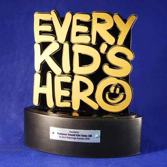 A bold and uplifting custom award featuring a polished black acrylic backing with raised gold lettering to create depth and visual impact.