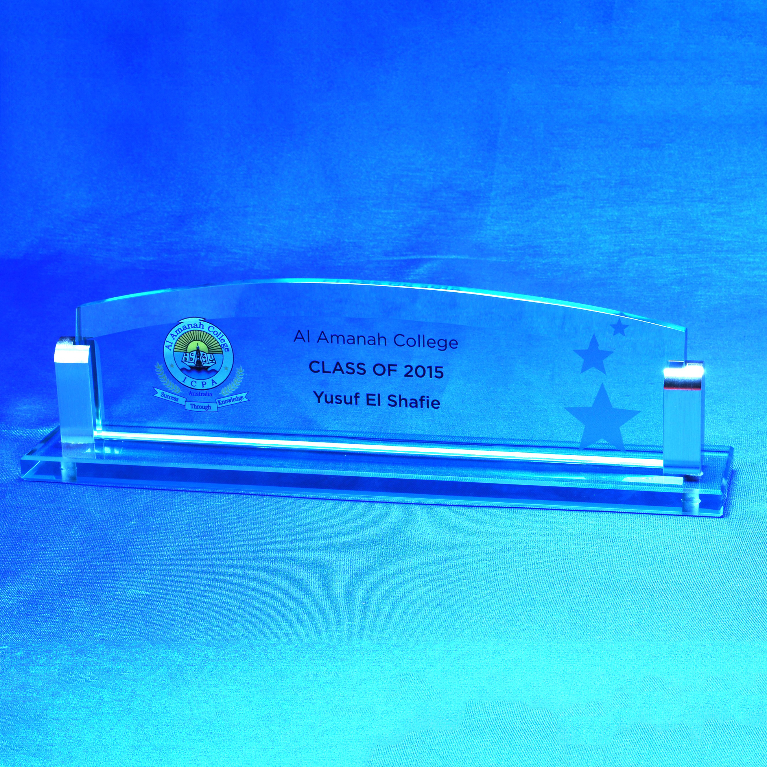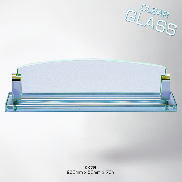 This elegant, clear glass desk name bar combines contemporary styling with professional presentation. Crafted from quality glass, it sits securely within brushed metal brackets that accentuate its clean lines and premium finish. Precision-etched engraving ensures sharp, lasting detail, adding a sophisticated touch to any office or executive space.