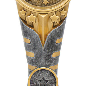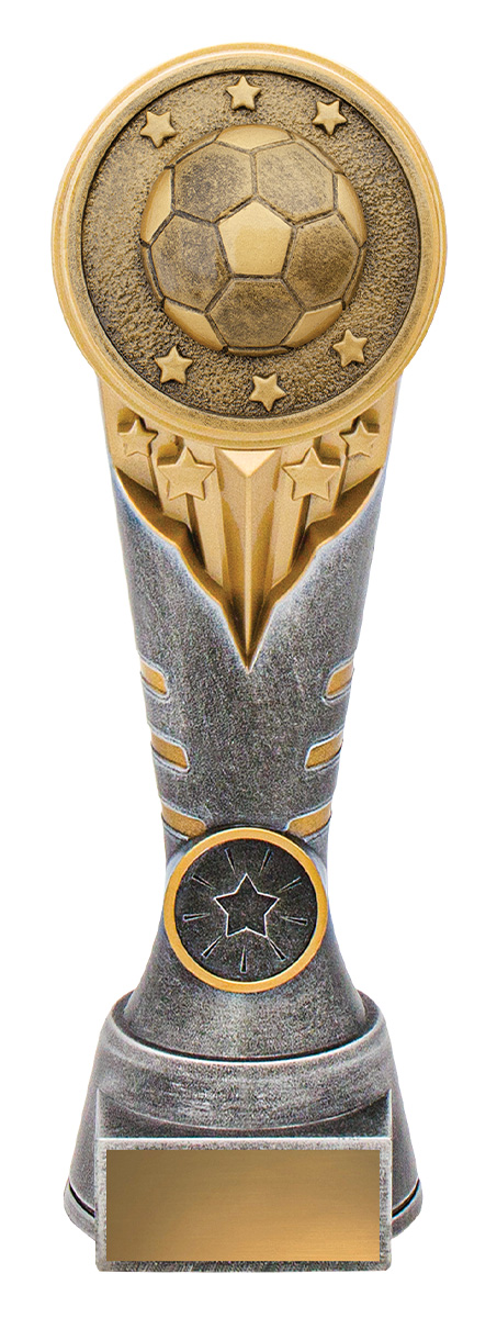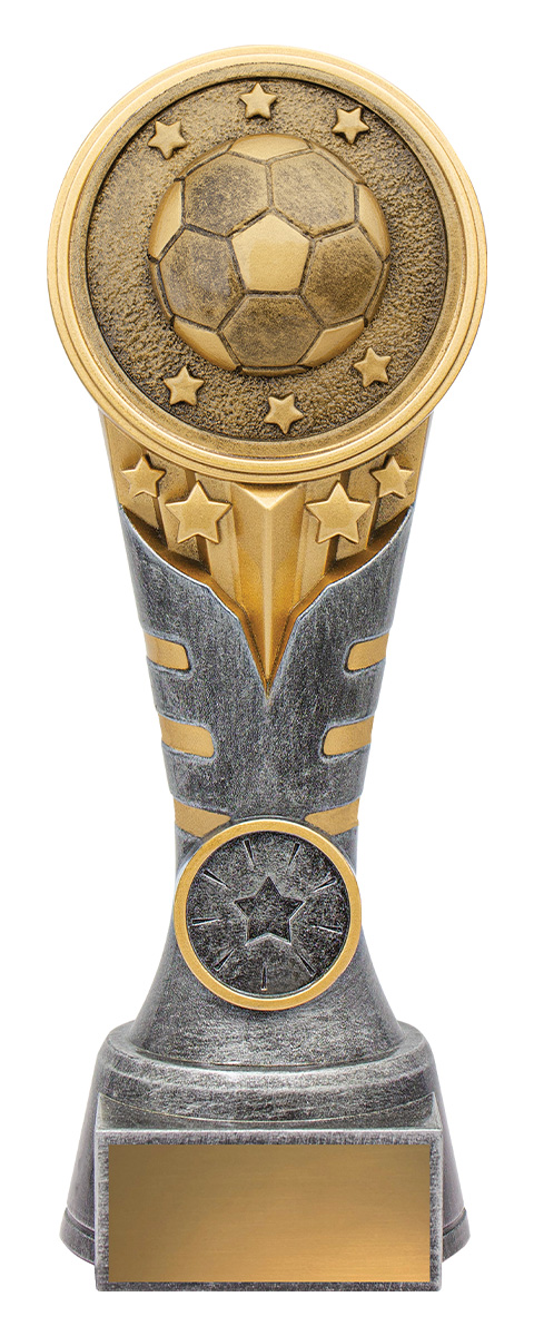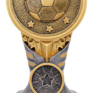 A premium choice among football trophies, this award combines elegant gold and silver finishes with a durable resin construction. The circular top is adorned with a dynamic football design and star accents, set above a sturdy rectangular base. Crafted for memorable recognition, it provides a sophisticated way to honour achievement in football.