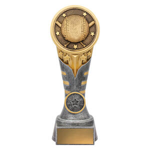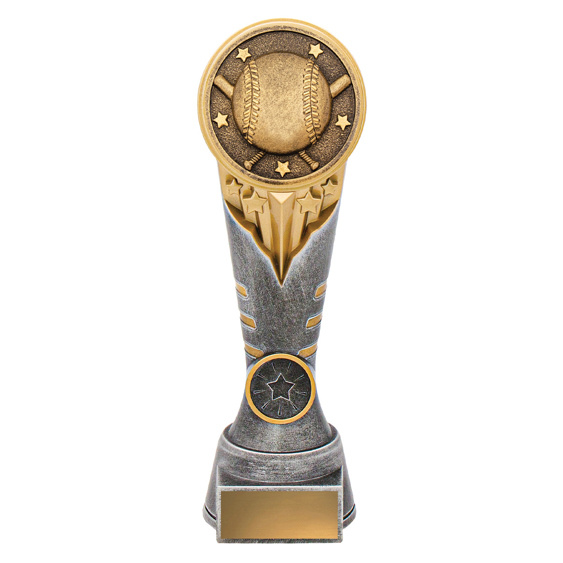 An elegant resin trophy in antique silver and gold tones, showcasing a baseball with crossed bats and stars. The compact yet bold design makes it ideal for team presentations, MVP awards, or junior player recognition. Includes a gold engraving plate for personalised text.