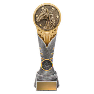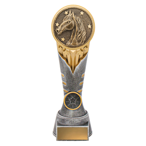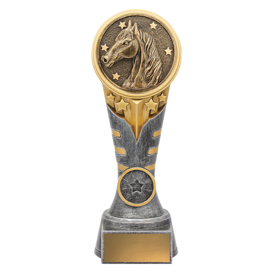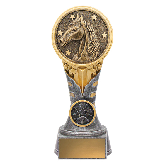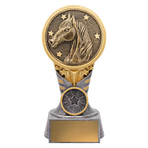 This starburst style horse trophy features a detailed horse head medallion framed by raised gold stars and textured silver tones. The sculpted base blends metallic grey and gold highlights for a bold, modern presentation suited to pony clubs, riding schools, equestrian achievement awards and general horse-sport recognition. Finished with a gold engraving plate for custom wording.