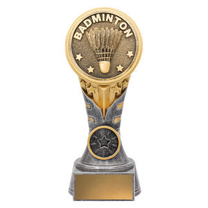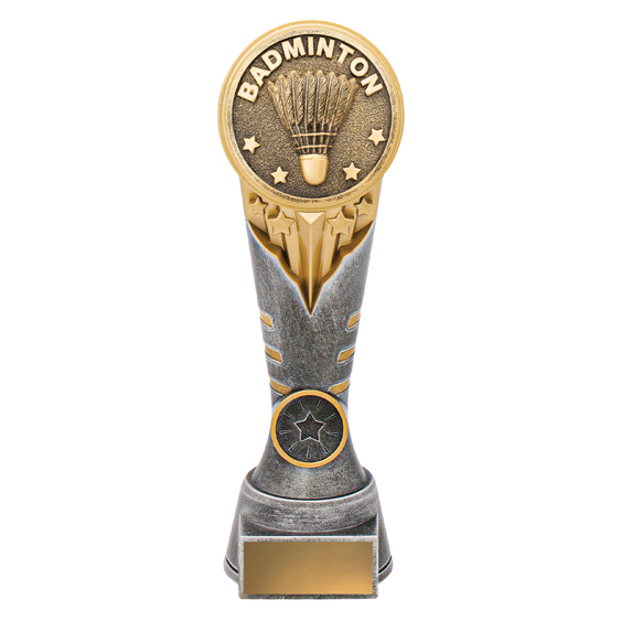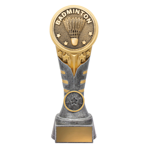The Badminton Shield Trophy displays crossed racquets and shuttlecock within a shield emblem, enhanced by gold trim and laurel detailing. Crafted in antique silver and gold resin, it represents strength and victory. Ideal for individual or team awards.
