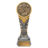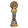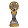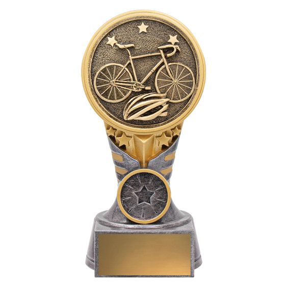This shield-style resin cycling trophy showcases a detailed mountain bike scene with forest background. The bold gold and black finish provides a premium look for mountain biking and off-road events. Supplied with an engraving plate for personalisation.