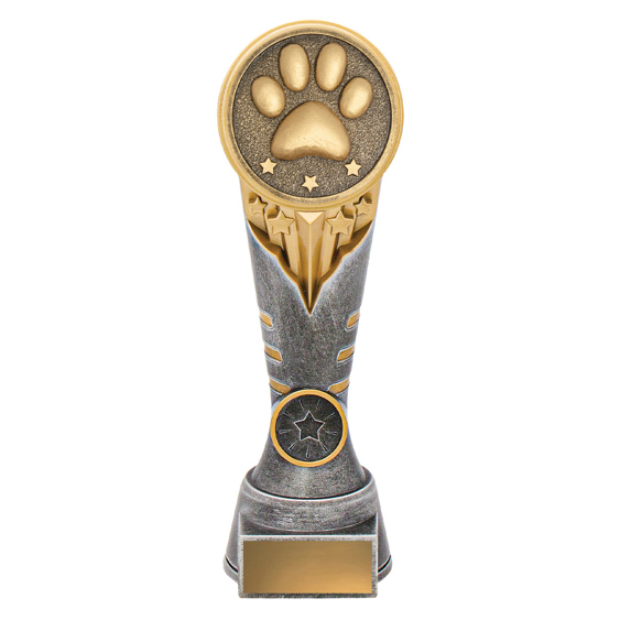 Paw Print Trophy features a raised gold paw emblem set on a sleek silver and gold riser with star accents. Ideal for animal clubs, obedience competitions, or pet shows, this design recognises achievement and companionship. Includes an engraving plate for personalised text.