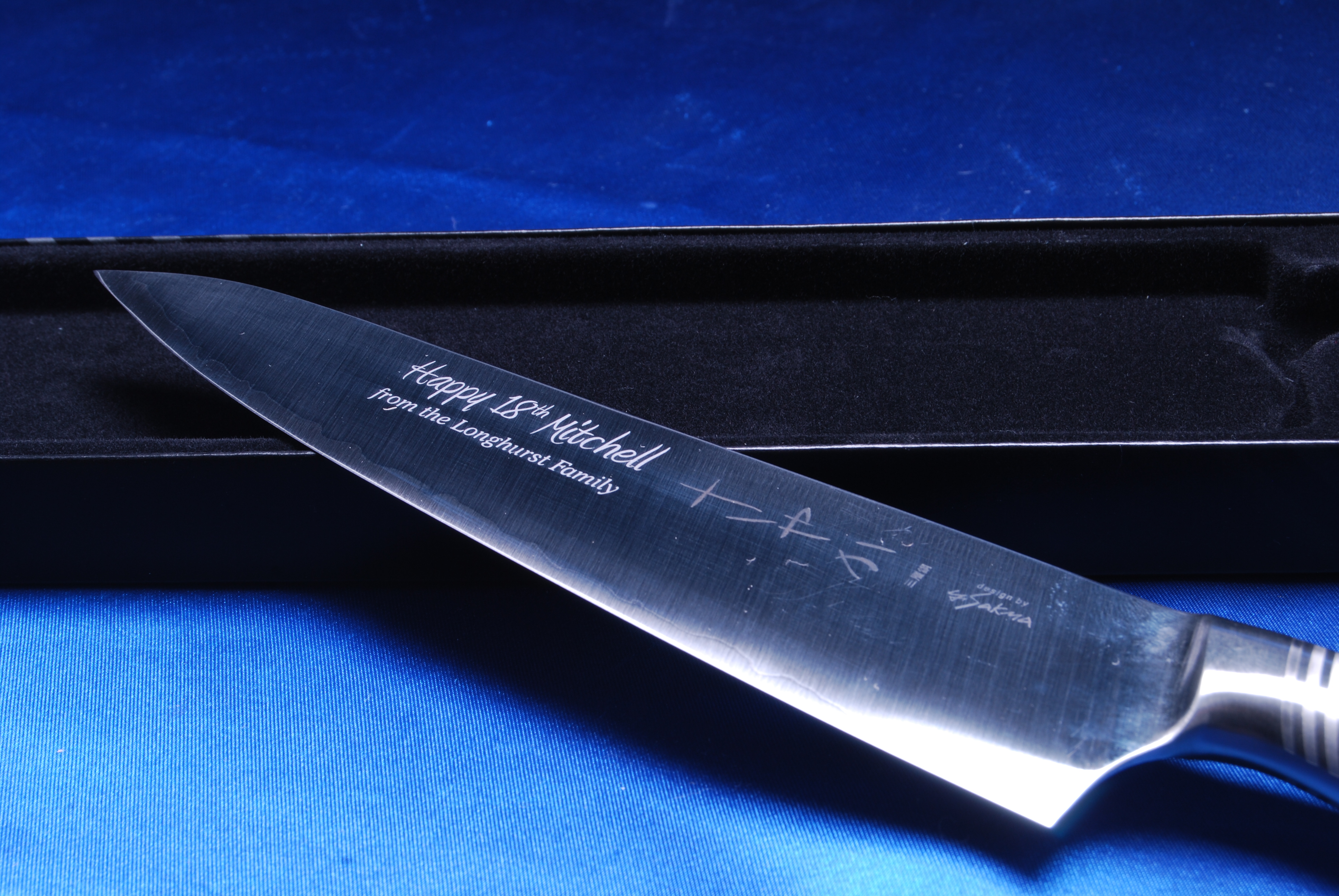 At Premier Awards, we offer precision knife engraving with expert craftsmanship and attention to detail. Whether it's a personal gift, commercial chef’s Knife engraving, a wedding keepsake, or security identification, we can professionally engrave any knife — from the blade to the handle — using high-quality laser technology.