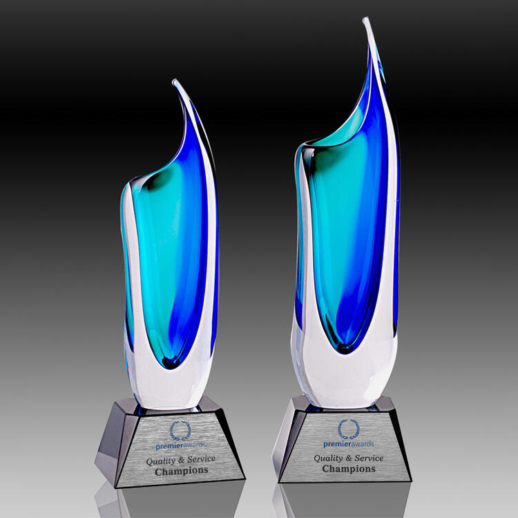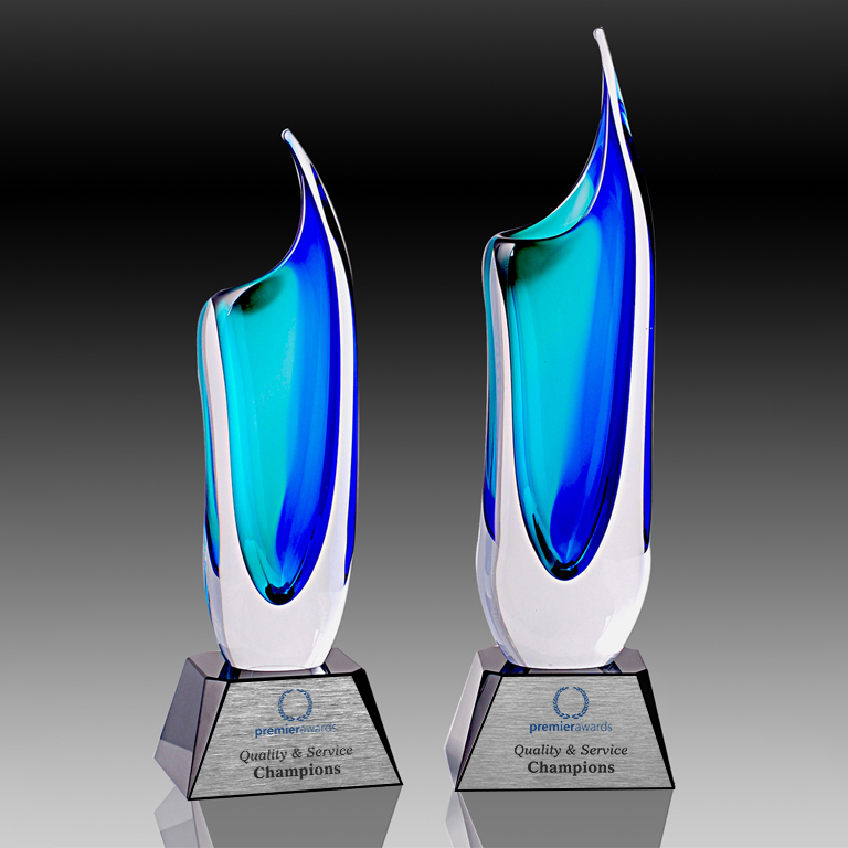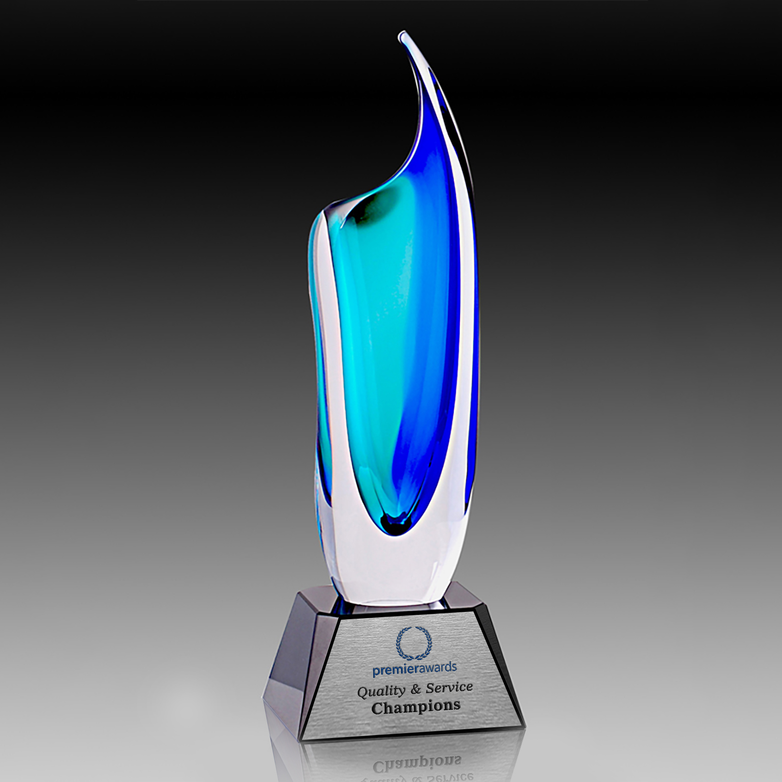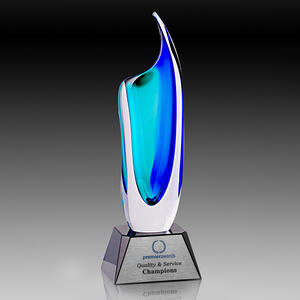 Art Glass Trophy - Vase Rose/Green On Black Base - With Printed Plate