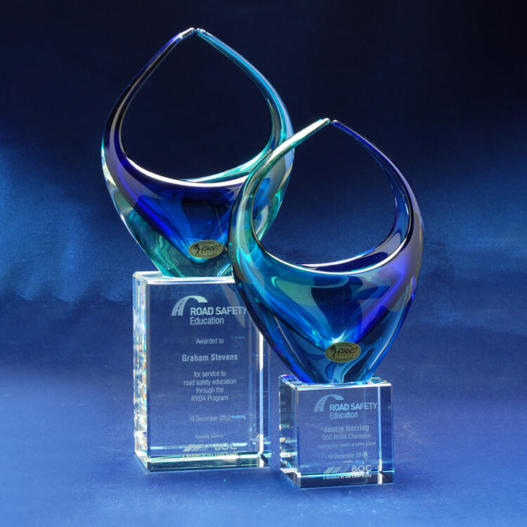 A glass award trophy of exceptional distinction, this art glass trophy showcases vibrant blue and turquoise hues swirling gracefully through blown crystal. The unique form is balanced by a clear crystal base, ensuring a professional and memorable presentation. Expert craftsmanship makes this piece a trusted choice for recognising achievement in corporate, educational, or community settings.