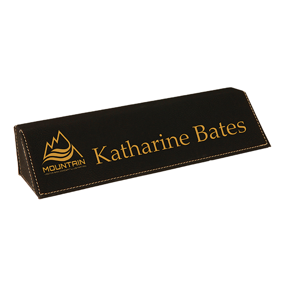 Crafted from black leatherette, this desk name bar adds a professional touch to any workspace. The smooth leatherette surface is laser engraved to produce crisp, gold lettering with excellent contrast and readability. Durable and stylish, it is an elegant solution for displaying names, titles, or company branding on desks, reception counters, or offices.