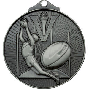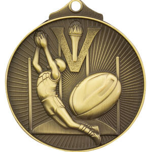 Celebrate sporting achievement with these distinguished aussie rules medals, expertly crafted in solid metal and offered in antique gold, silver, and bronze finishes. The circular 52mm design features a bold 3D depiction of a player catching a ball, goal posts, and a prominent 'V' with a torch, framed by an extra thick edge for added durability.