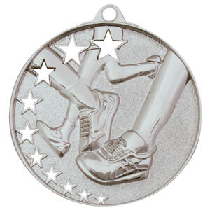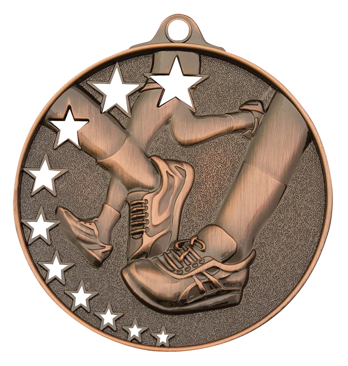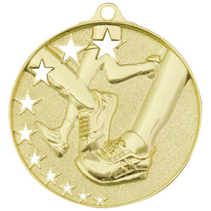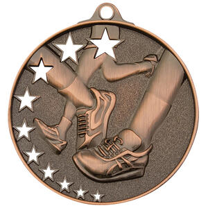 This athletics medal is a tribute to dedication and sporting achievement. Crafted in bronze, silver, or gold metal, its circular form is highlighted by a design featuring running shoes, legs in motion, and striking star cutouts. With a convenient loop for hanging, it offers a lasting and meaningful symbol of recognition for running excellence.