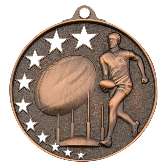 Celebrate achievement on the field with this aussie rules football medal, expertly crafted in a durable 52mm circular metal design. Available in gold, silver, and bronze finishes, it showcases a dynamic player with ball, goalposts, and star themed detailing in the centre. A distinctive star border adds a memorable and professional touch, perfect for recognising excellence in Aussie Rules Football.