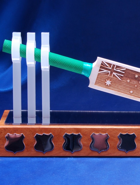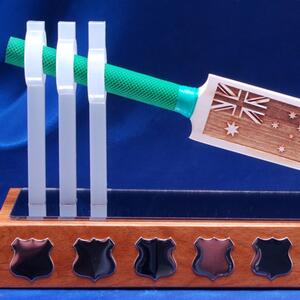 A creative perpetual trophy featuring a miniature timber cricket bat with laser engraving, mounted on a clear acrylic stand and solid timber base.
