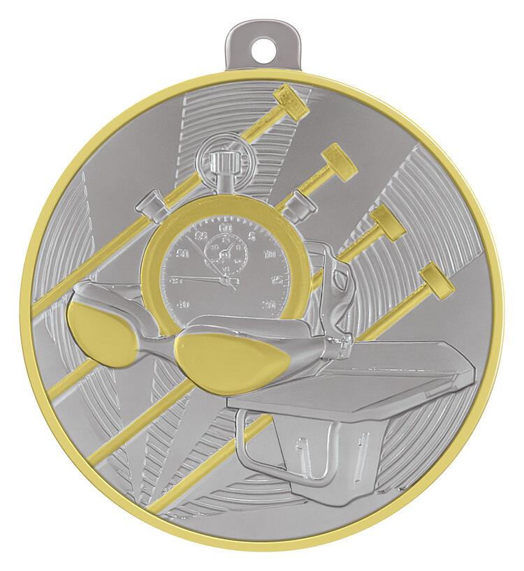 Crafted in silver and gold metal, this circular award is a standout in the swimming medals collection. The design features a precise arrangement of a stopwatch, swimming goggles, and a diving block, celebrating the dedication and skill unique to the sport. Its robust build and elegant detailing make it a memorable way to honour swimmersÂ’ achievements.