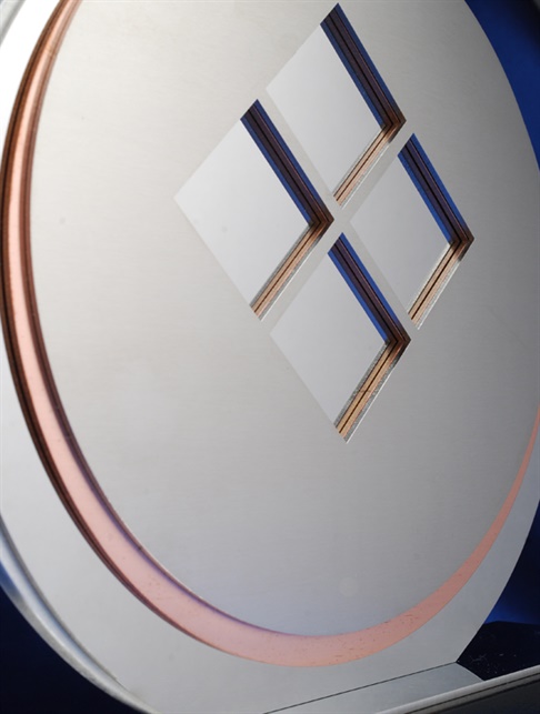 A refined custom metal trophy featuring a circular brushed alloy face with recessed geometric accents and a contrasting black base.