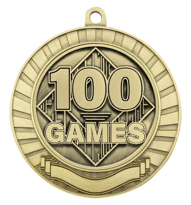 Mark a significant milestone with this gold Eco Scroll 100 Games Medal, crafted to honour dedication across general sports. Its substantial 52mm circular design features the '100 Games' achievement at the forefront, complemented by a custom insert area for club representation.