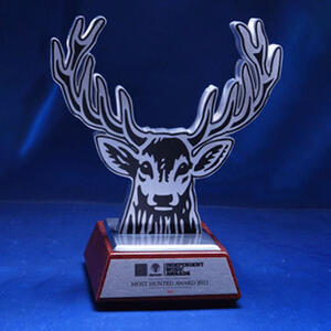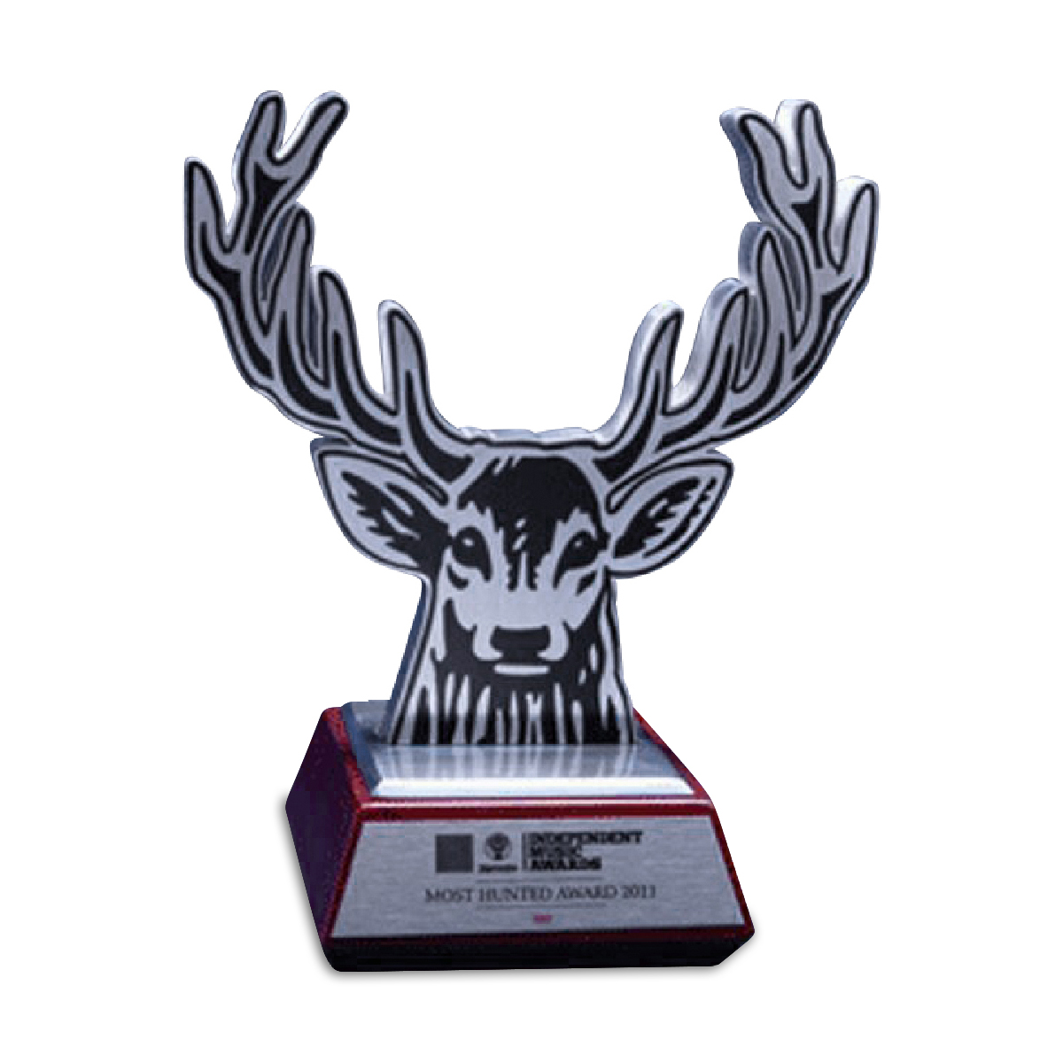 A striking custom perpetual trophy crafted from polished alloy, featuring precision etching and detailed paint fill. The bold stag silhouette design makes it a standout piece, perfect for corporate or event-based annual awards with a distinctive modern edge.