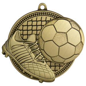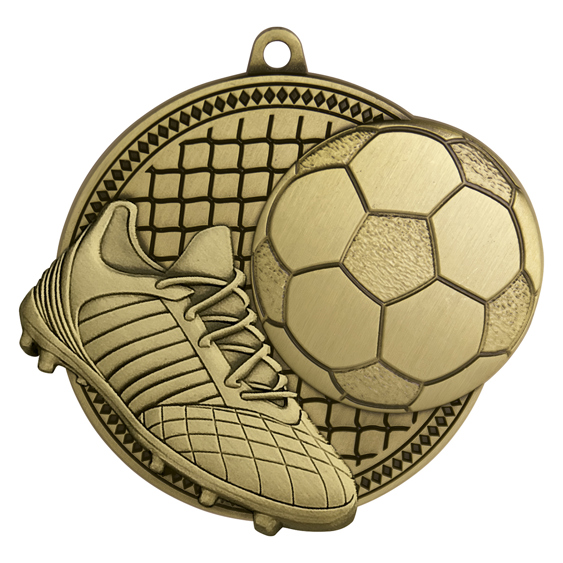 This gold football medal showcases a bold, circular design with finely embossed football and boot elements. Crafted from quality metal, it offers a durable and elegant finish that stands out in any presentation. The 55mm diameter and integrated loop make it a fitting choice for recognising skill and achievement on the football field.