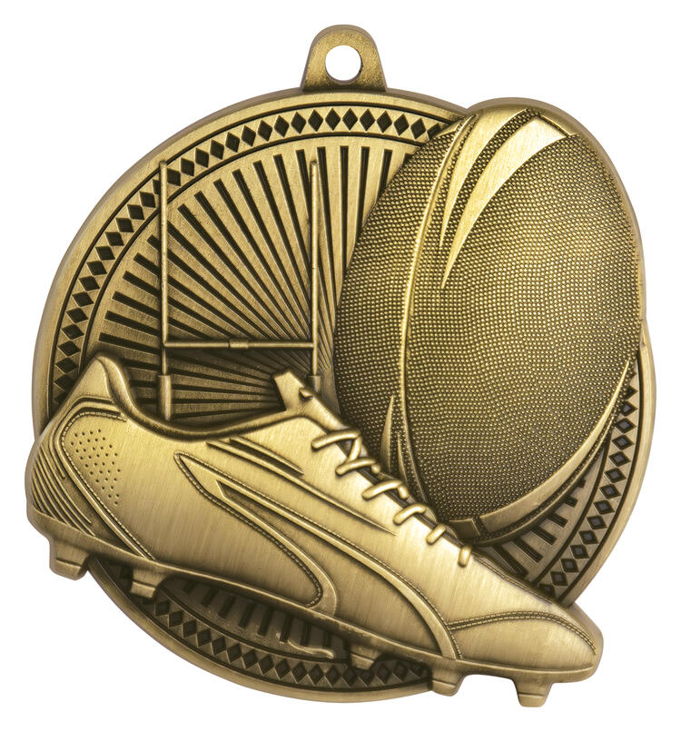 This rugby medal is crafted in a classic gold finish, featuring a circular metal form with expertly embossed details. Showcasing a rugby ball, boot, and goalposts, its design celebrates the spirit and achievement found in the game. The Tempo Medal 55mm is a trusted recognition piece, perfect for commemorating commitment and skill in rugby.