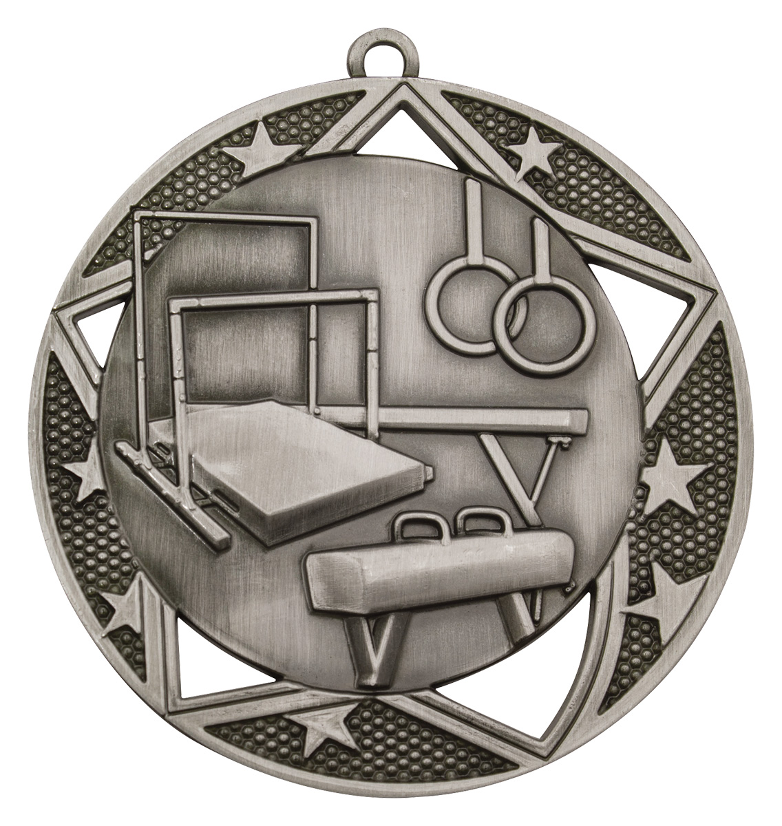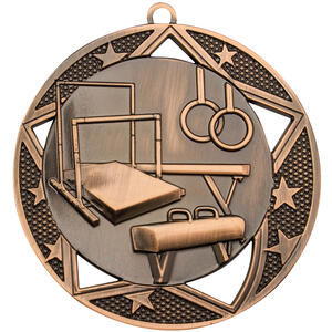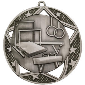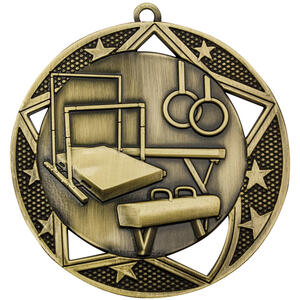 This metal gymnastics medal features a striking circular design, highlighted by a star patterned border and offered in gold, silver, and bronze finishes. Embossed imagery of rings, parallel bars, and pommel horse celebrates achievement across the discipline. Crafted for lasting recognition, it stands out among gymnastics medals as a distinguished choice for rewarding excellence.