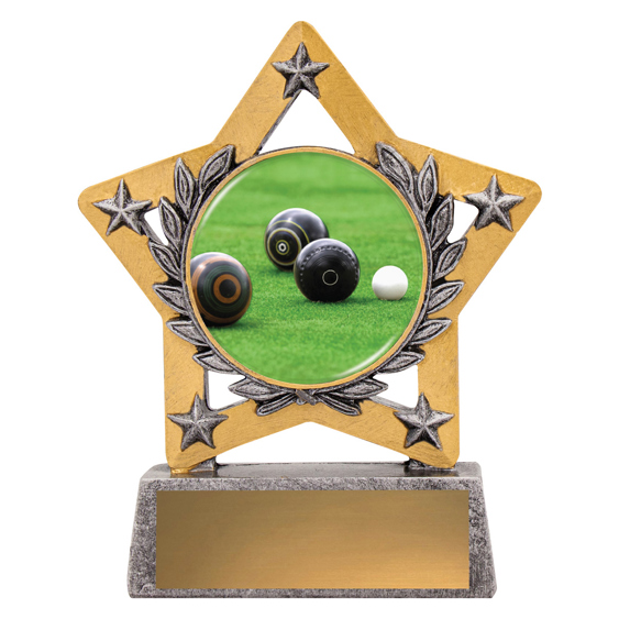 Bright star shaped lawn bowls trophy in gold and silver tones. Featuring a vibrant image centre, this compact design is ideal for participation awards and club presentations.