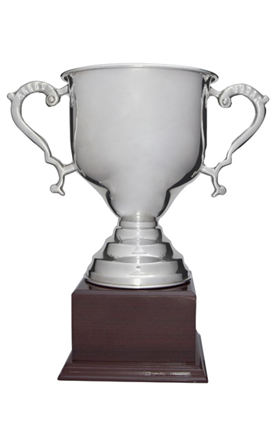 A refined symbol of achievement, this silver metal cup presents a timeless design with its polished finish and classic handles. Resting on a sturdy brown wooden base, it balances contemporary metallic elegance with warm, natural accents. Crafted for versatility.