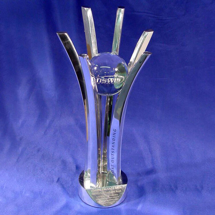 Crafted from polished alloy, its elegant, upward reaching spires cradle an optical crystal sphere, etched and painted with your logo.