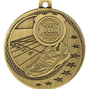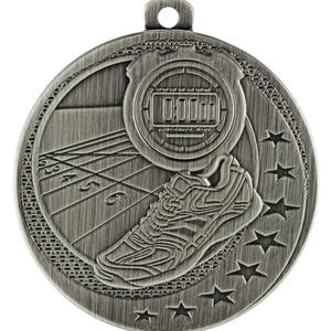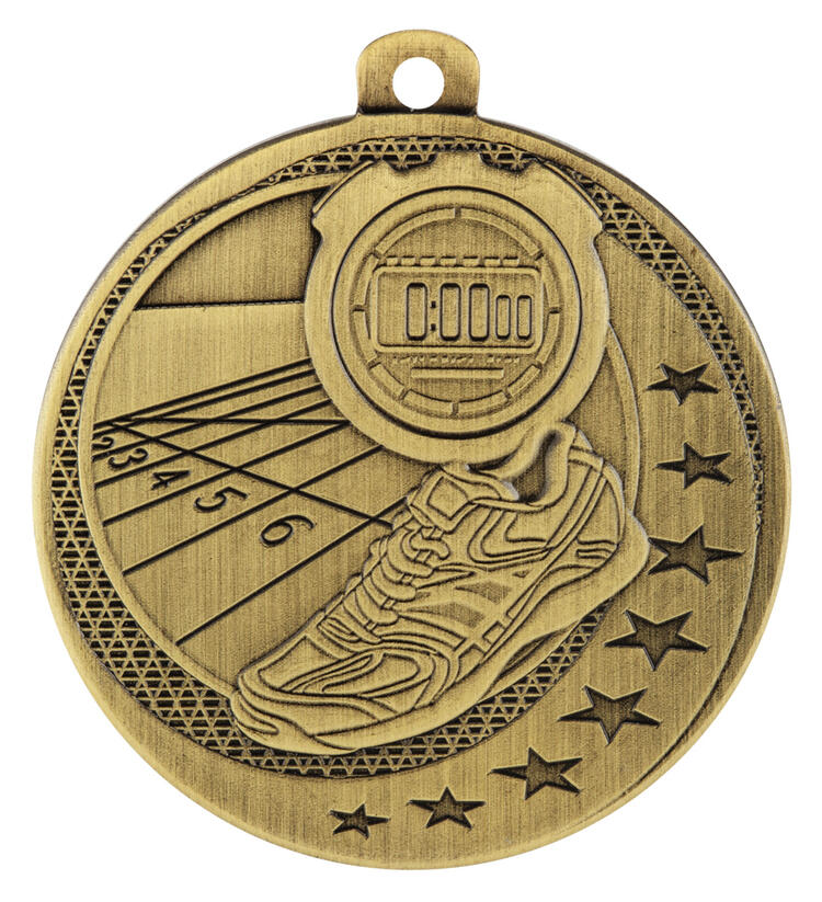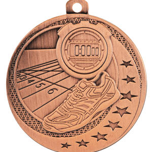 This athletics medal is expertly crafted from metal, featuring a circular shape with a loop for convenient display. Available in silver, gold, and bronze, it highlights a stopwatch, running shoe, and track, accentuated by star motifs. Designed for lasting recognition, it is a durable and elegant choice for honouring achievement in athletics medals presentations.