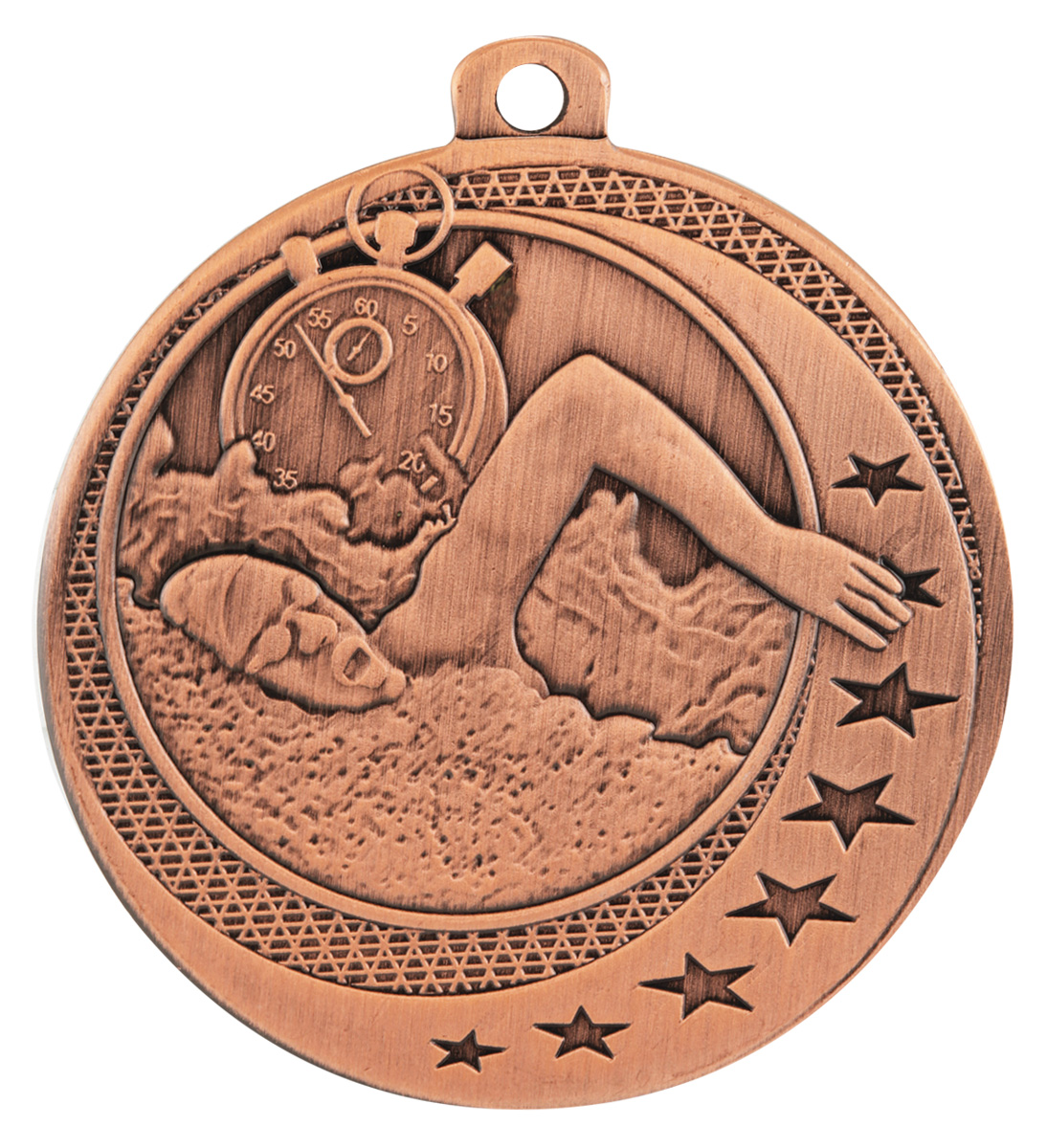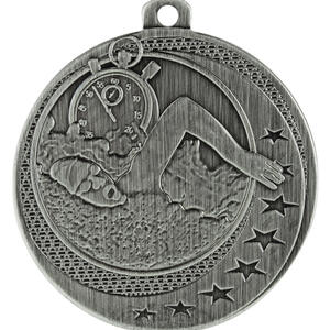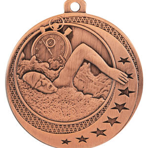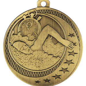 Celebrate achievement in the pool with this circular metal swimming medal, available in gold, silver, or bronze finishes. The star inspired design features a swimmer in action against a detailed stop watch backdrop, offering distinctive recognition for swimmers' dedication and skill. Durable, elegant, and part of the trusted Wayfare Medals range, these swimming medals are crafted for memorable presentations.
