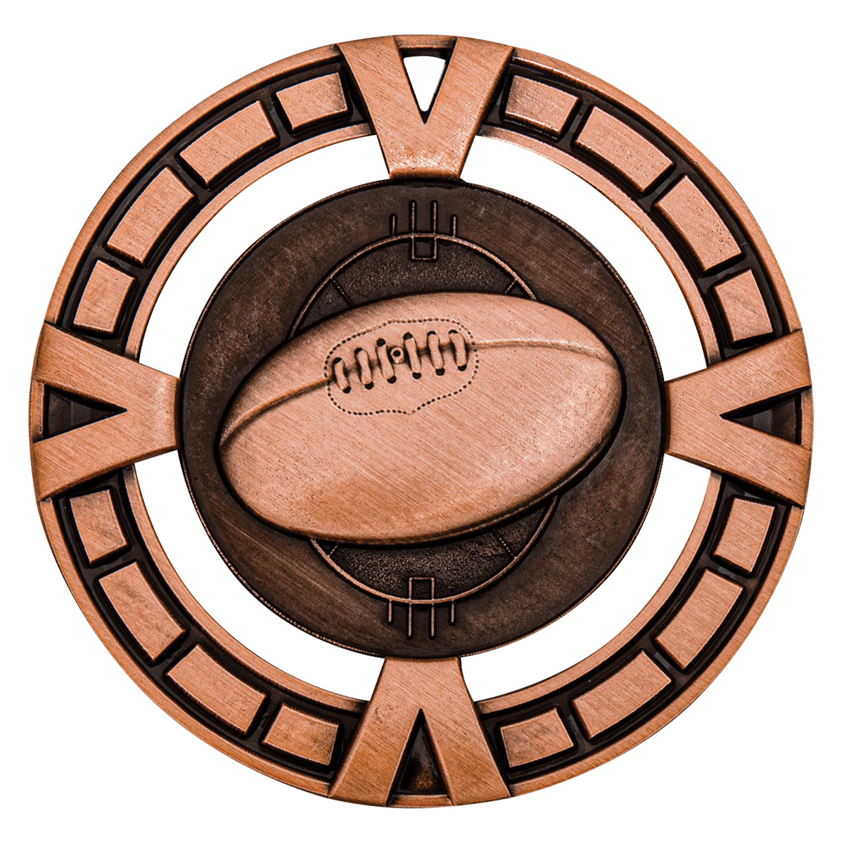 Crafted for distinction, this 65mm metal medal celebrates achievement in Aussie Rules Football with a striking central design of a football and goalposts, encircled by an intricate decorative border. Available in gold, silver, or bronze finishes, it features a unique cut off compass detail and a generous engraving area on the reverse.