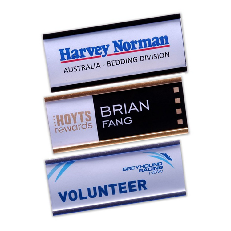 The badge size is 72mm x 32mm. Available in a choice of border finishes, including gold, silver, or black, with magnetic or pin fasteners available.