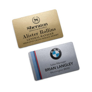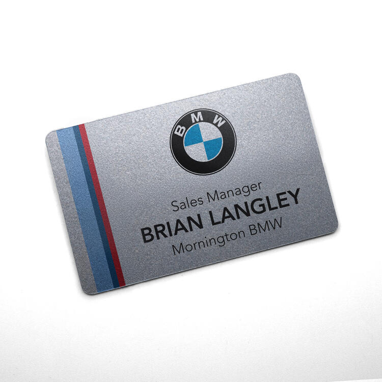 The NBI Name Badge, available in gold or silver backgrounds, delivers a polished, professional look with its full-colour printed design on a durable plastic base.