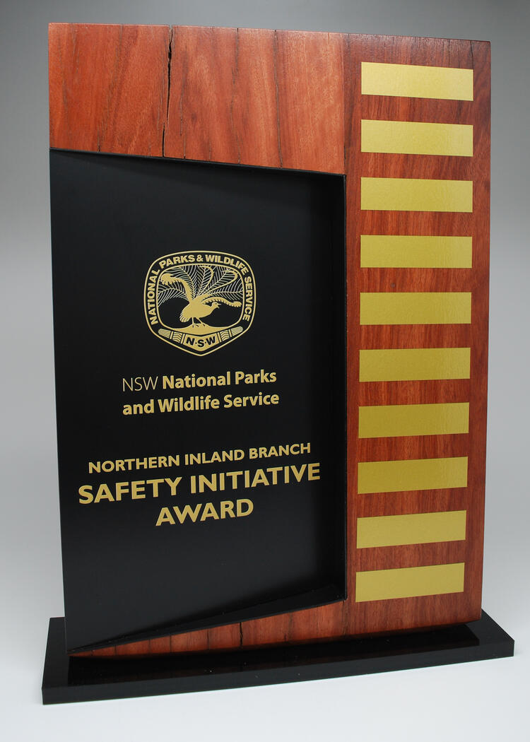 A contemporary perpetual award crafted from rich natural timber with a recessed black brass panel, precision engraved and gold paint filled for a refined finish.