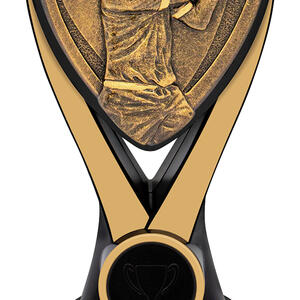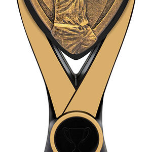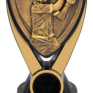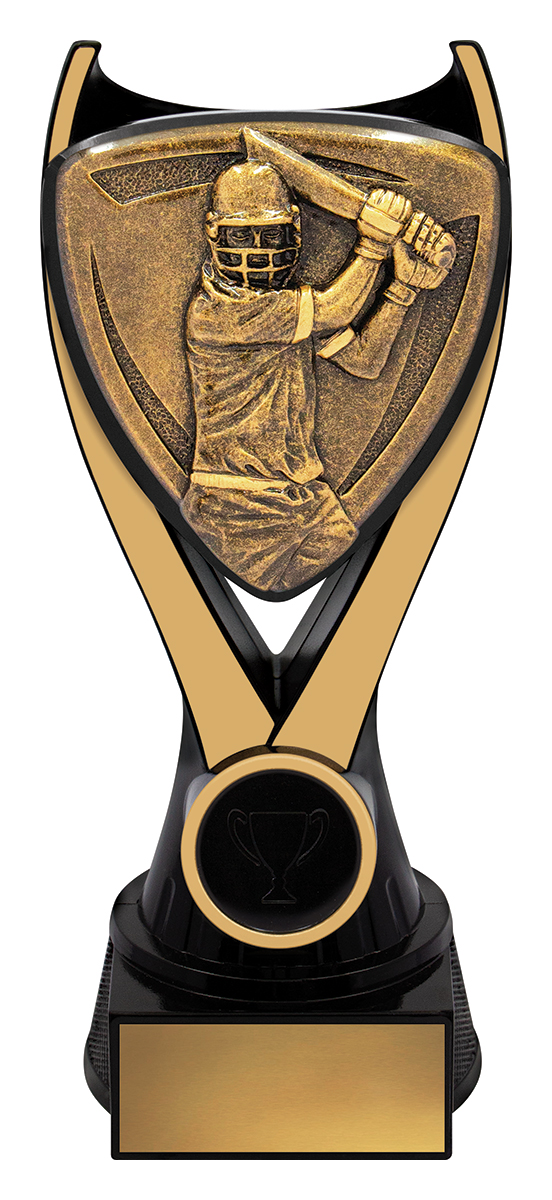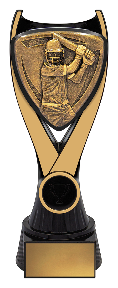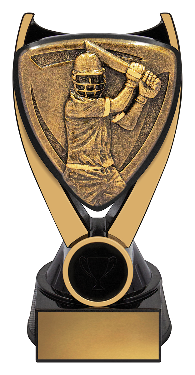 This striking shield shaped trophy in gold and black is expertly crafted for cricket recognition. Featuring a detailed batsman in action, it captures the spirit of achievement in cricket. This award stands as a proud symbol among cricket trophies for memorable presentations and team celebrations.