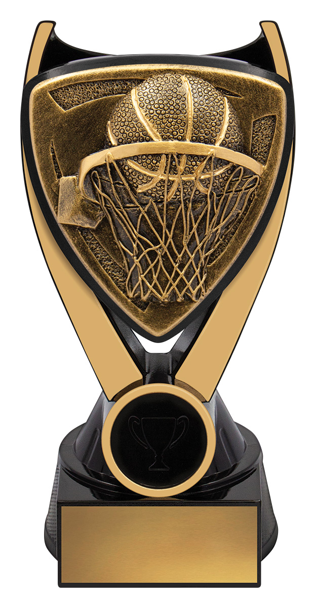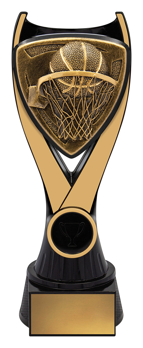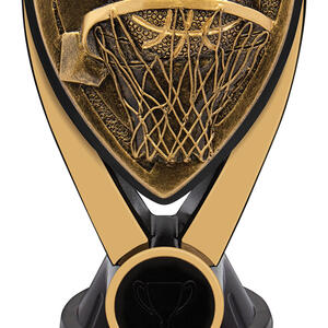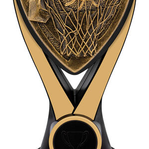 This dynamic trophy celebrates basketball achievement with a striking gold and black finish. Designed with a basketball and hoop motif, it stands as a testament to sporting effort and team spirit. Crafted from durable resin, this piece fits seamlessly within basketball trophies collections and features a base suitable for engraving.