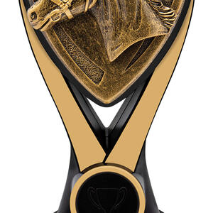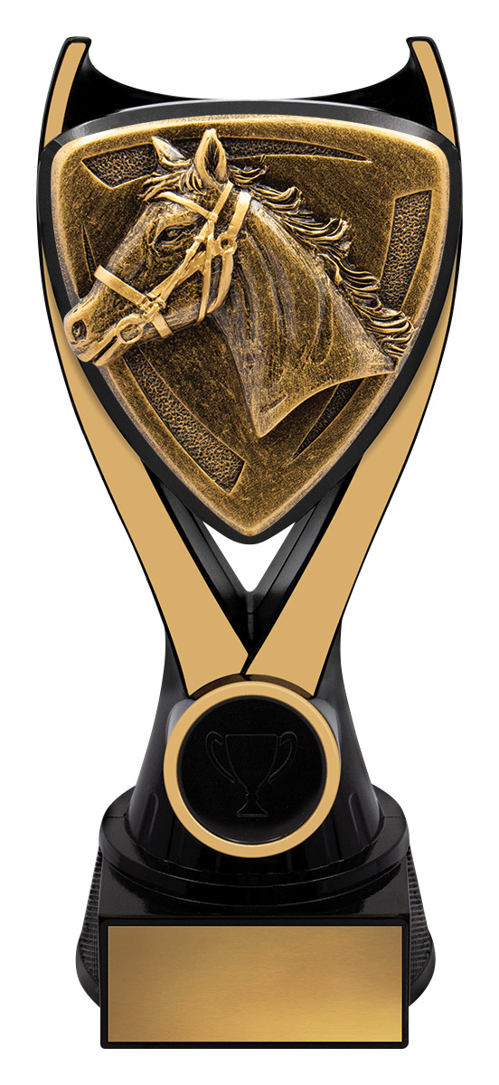 This contemporary award captures the spirit of the arena with its shield inspired form and distinguished horse head design. Crafted from resin in gold and black. it balances durability and style. Nova Horse stands as a reliable choice among equestrian trophies, offering a memorable tribute to achievement in horse sports.