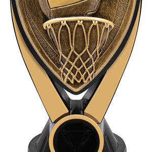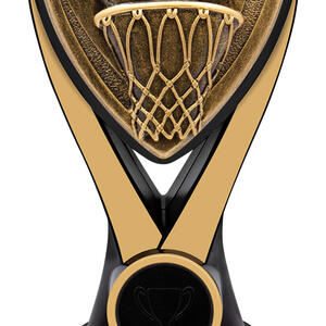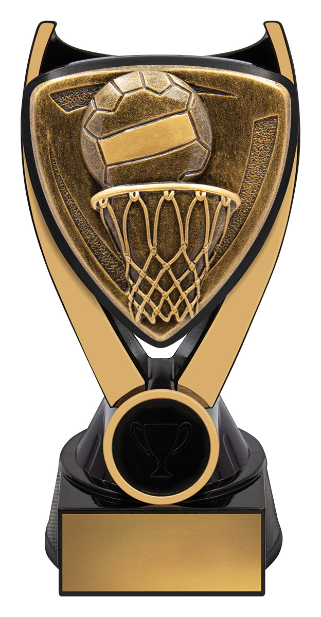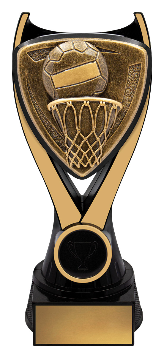 This contemporary trophy celebrates achievement in netball with an elegant shield like form and circular base. Finished in gold and black, it features a dynamic netball and hoop design that stands out in any award presentation. A standout choice among netball trophies, it offers a durable and stylish way to honour skill and dedication on the court.