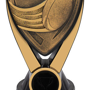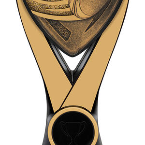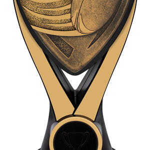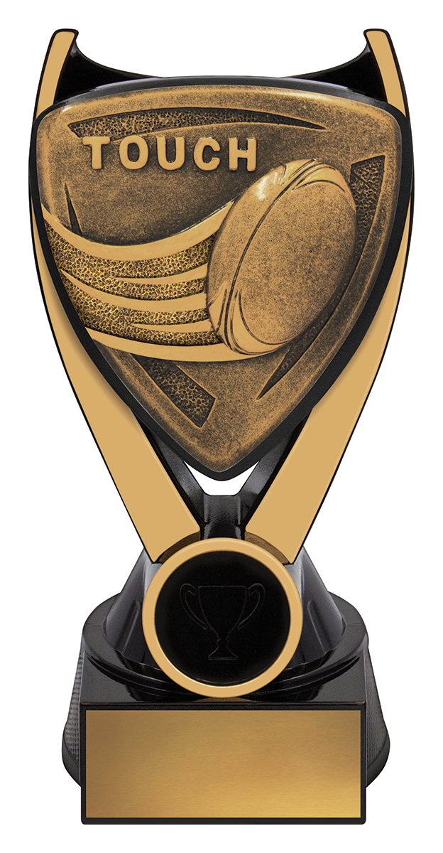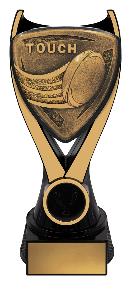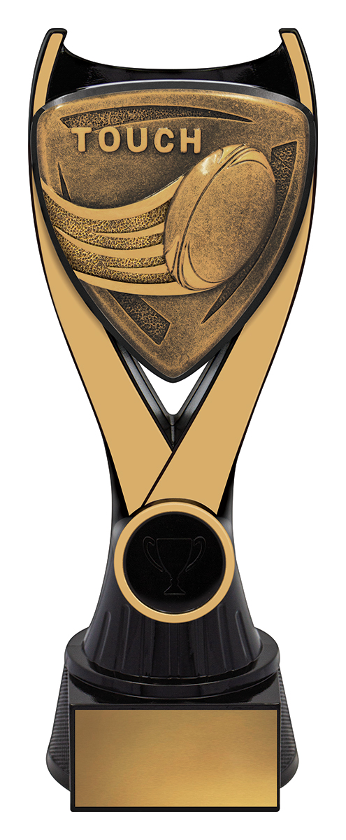 This touch football trophy from the Nova Series features a bold shield design in gold and black, accented by a dynamic ball graphic and the word 'TOUCH'. Crafted from durable materials with a circular base, it offers an elegant and contemporary way to recognise achievement in touch football. Its distinctive style makes it a memorable and professional award choice.