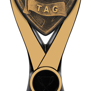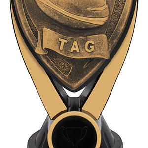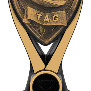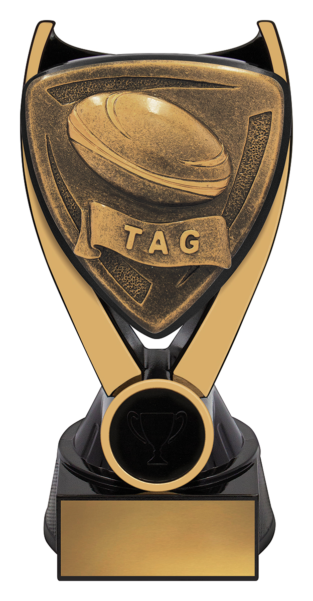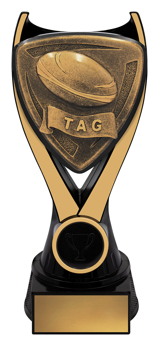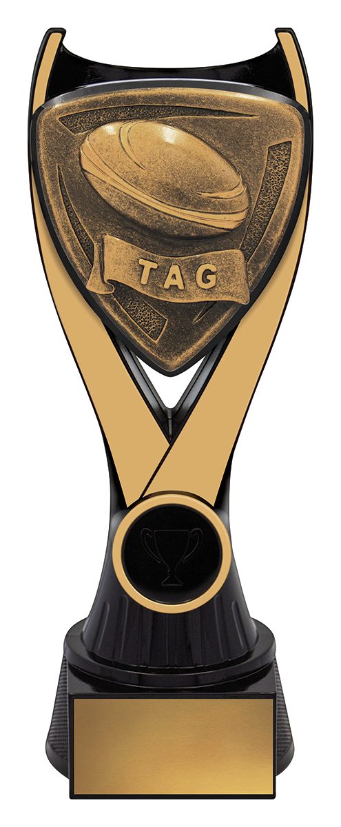 Celebrate achievement on the tag rugby field with this oz tag trophy from the Nova Series. Showcasing a classic shield design in striking gold and black, it features a detailed rugby ball motif and the word TAG elegantly integrated into its metal and plastic construction. This trophy delivers a memorable and professional recognition experience for teams and individuals alike.
