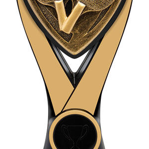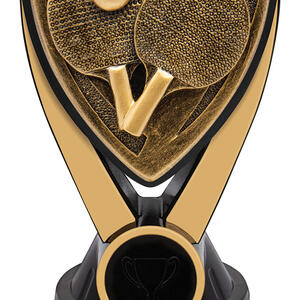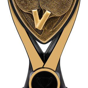 This table tennis trophy features an elegant triangular shield design, crafted from resin for a refined and lasting finish. Gold and black tones provide a sophisticated contrast, while the detailed depiction of two paddles and a ball celebrates the spirit of the game. A fitting choice for recognising skill and achievement in table tennis competitions.