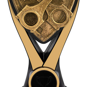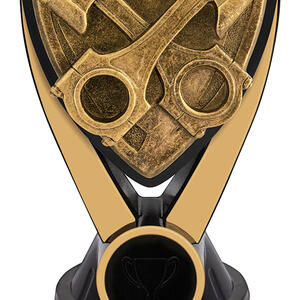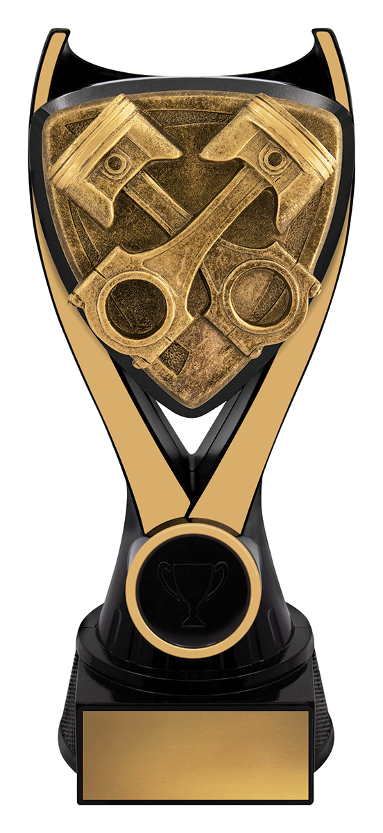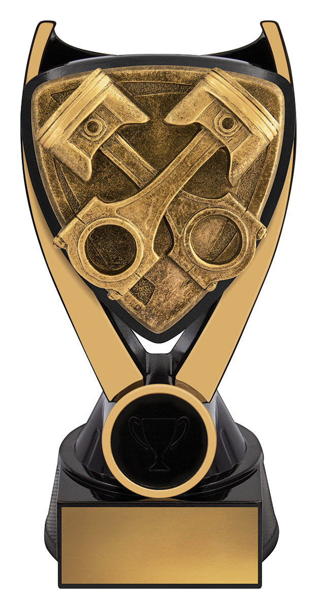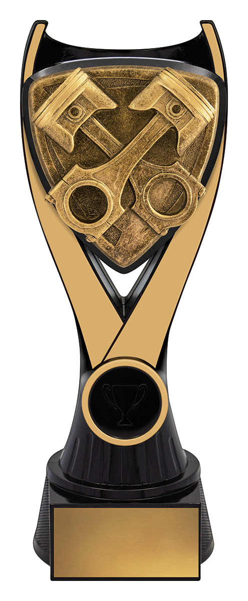 Bold and refined, this motorsport trophy features a distinctive crossed piston design set on a shield, embodying the drive and discipline of motorsport achievement. Crafted from resin in a classic gold and black finish, it stands on a black base ideal for personalisation. Nova Pistons makes a memorable addition to premier motorsport trophies, designed to celebrate outstanding performance.