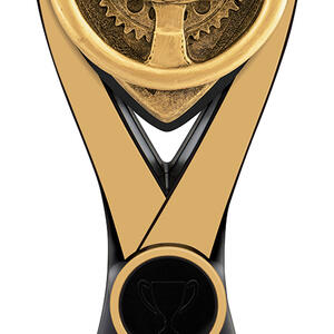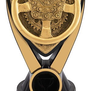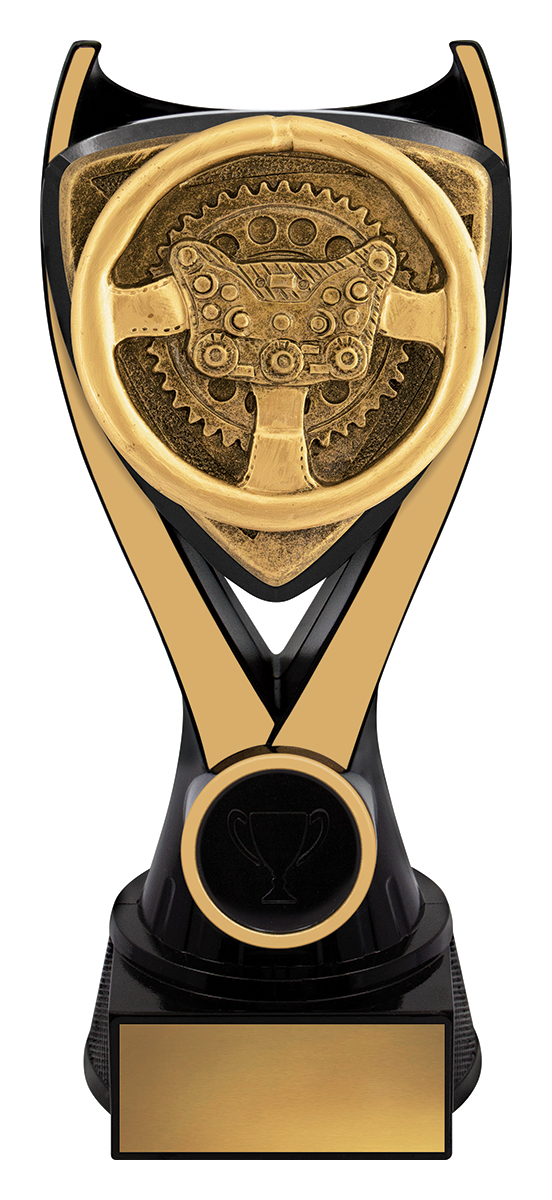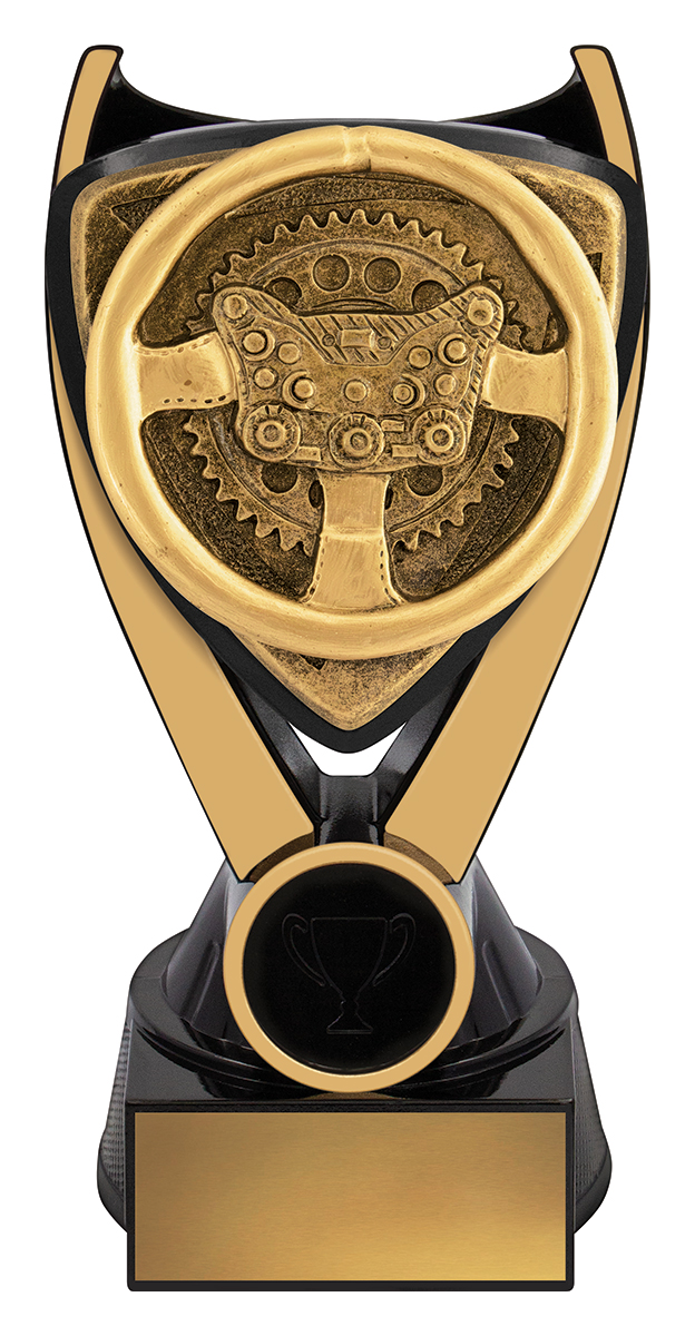 This motorsport trophy showcases a striking gold and black design, crafted from resin material. A circular emblem at its centre features an intricate steering wheel and gear motif, capturing the essence of racing achievement. Crafted for motorsport trophies collections, it provides a distinctive and memorable recognition option for any competitive event.