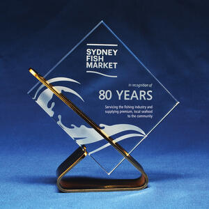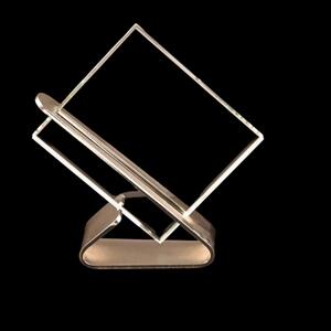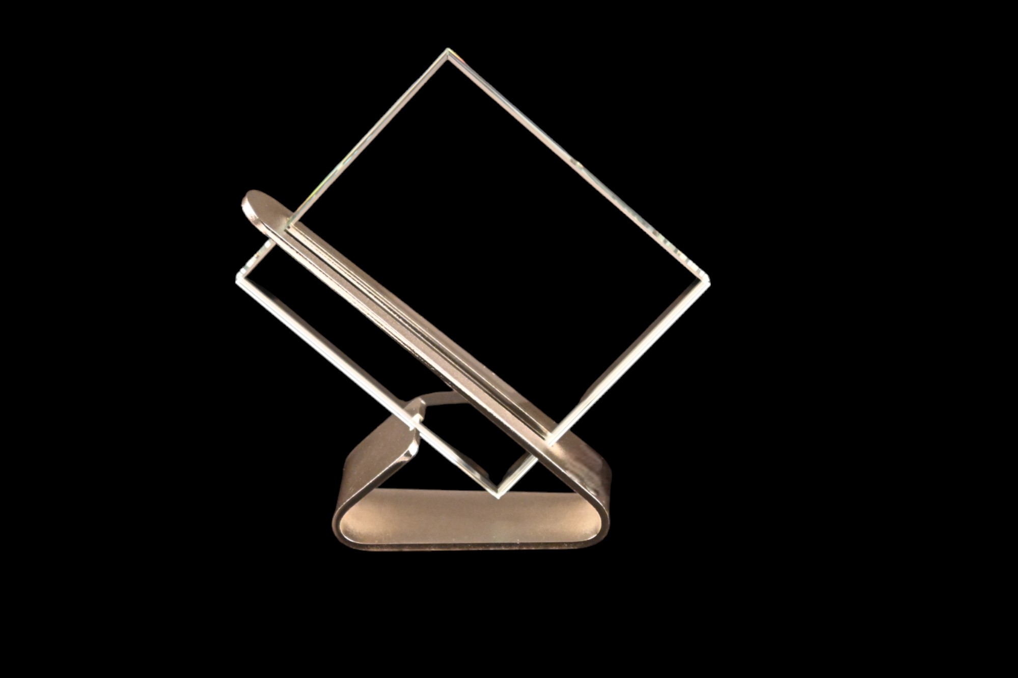 A contemporary crystal desk award featuring a clean, geometric crystal panel paired with a sculptural metal stand. The crystal clear panel provides a refined surface for your custom branding, while the sweeping metallic base adds a touch of luxury and modern design. Perfect as a corporate recognition piece, business gift, or branded display item, this award offers a sleek, minimalist aesthetic suited to premium presentations and office environments.