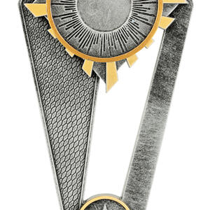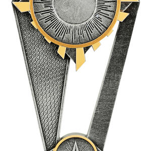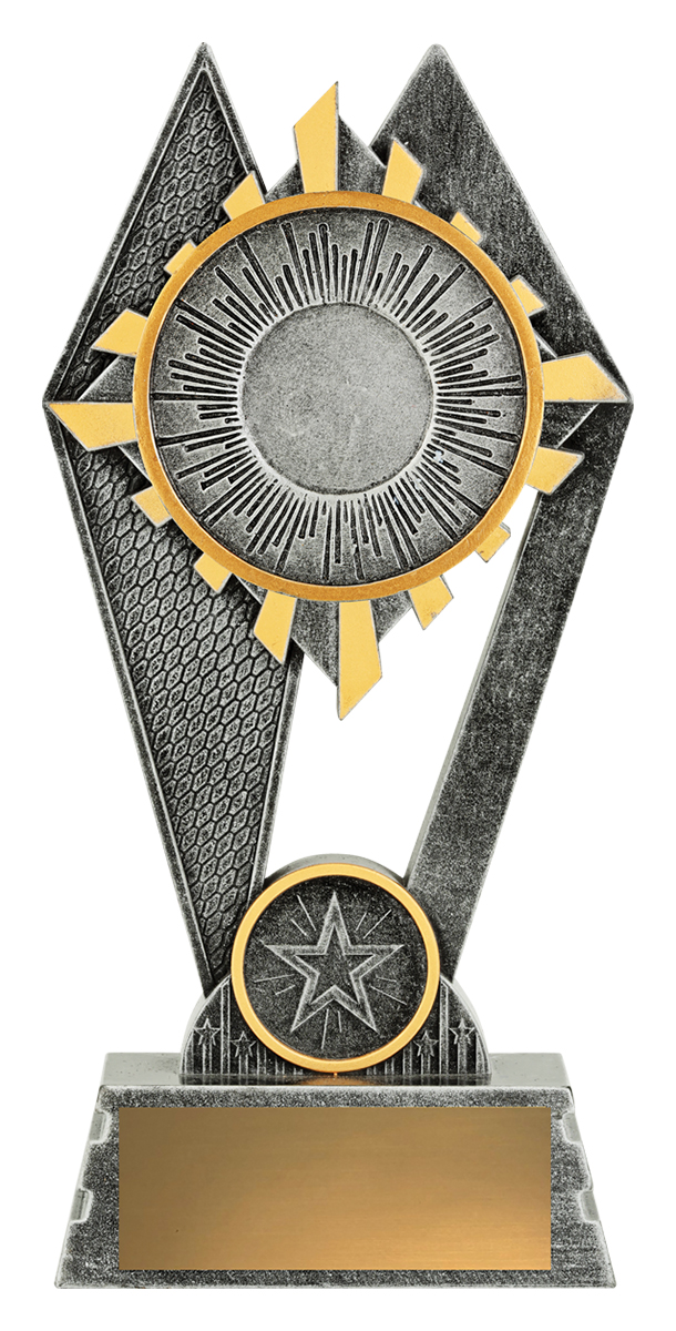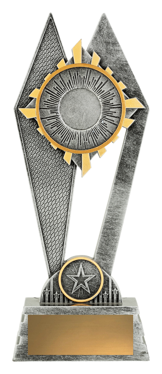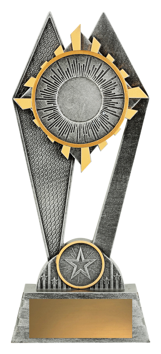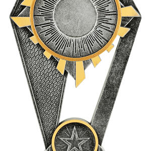 With a striking geometric design, this trophy features a harmonious blend of silver and gold tones, making it a standout among award trophies. The star emblem and radiant sunburst motif convey achievement and distinction, while the resin finish ensures lasting quality. An ideal choice for recognising general achievement across any occasion.